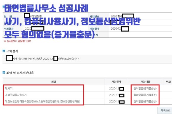 [사기, 컴퓨터등사용사기, 정보통신망법위반 모두 혐의없음, 출처: 태연법률사무소]
