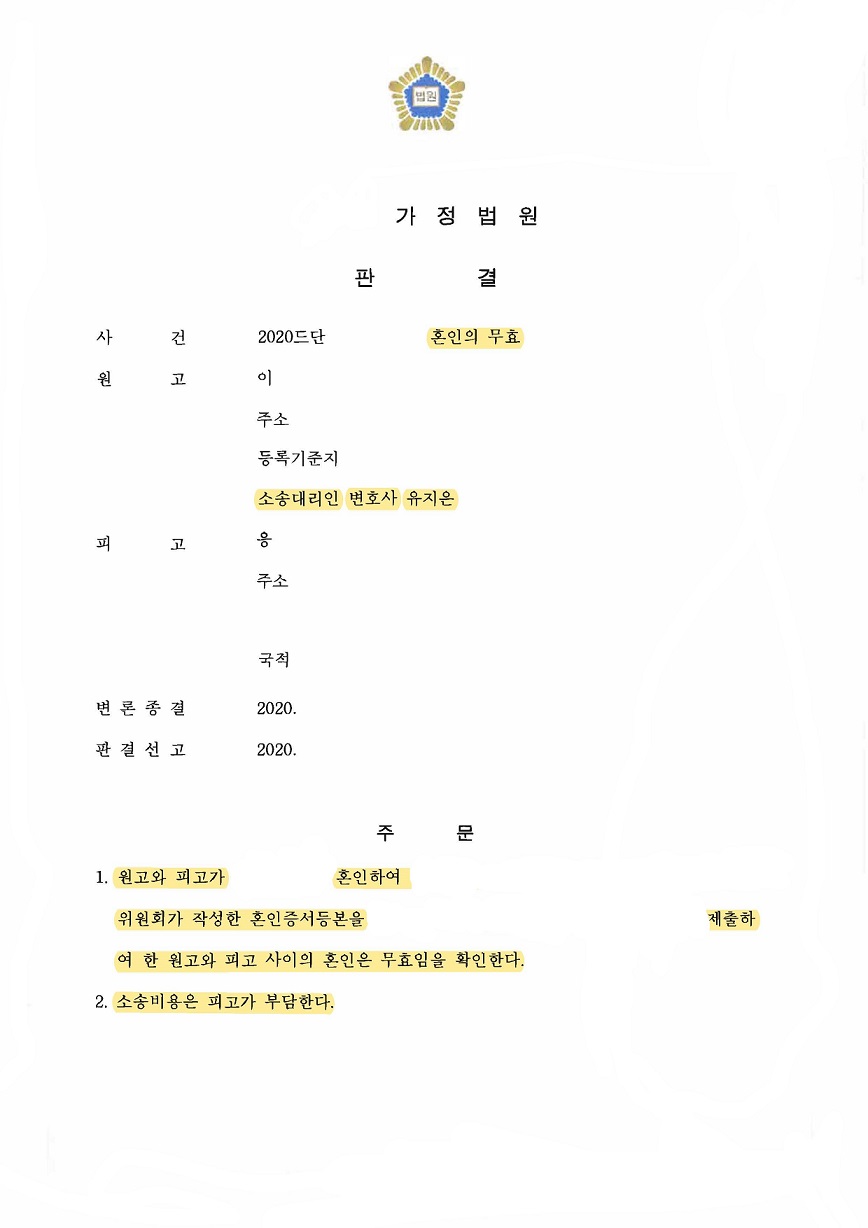 혼인신고를 마치고 일정 기간 동거를 한 이상 혼인무효가 인정되기는 매우 어려우므로 대다수의 경우 혼인무효가 아닌 이혼으로 관계를 정리하고 있습니다. 하지만 의뢰인은 이혼이 아닌 혼인무효 판결을 받기를 간절히 희망하였고, 결국 혼인무효 판결을 받았고, 이로 인하여 의뢰인이 매우 만족한 의미 있는 사건이었습니다.