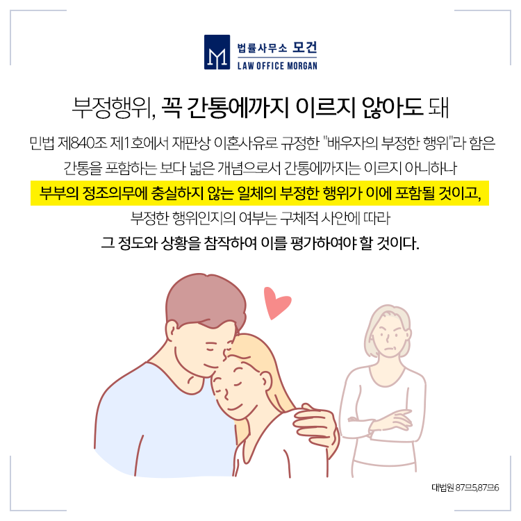 가장 대표적인 이혼사유라 할 수 있는 '배우자의 부정행위'는 꼭 성적인 관계를 의미하는 것이 아니라 부부의 정조의무에 충실하지 않는 일체의 부정행위를 말합니다. 이러한 부정행위는 국제결혼에서도 많이 나타나는데요. 직업상 해외출장이나 해외거주가 불가피 한 경우 알고보니 따로 만남을 갖고 있던 상대방이 있다거나, 언어나 문화적 동질감으로 인해 같은 국적의 상대방과 부정행위를 하는 경우도 있습니다.