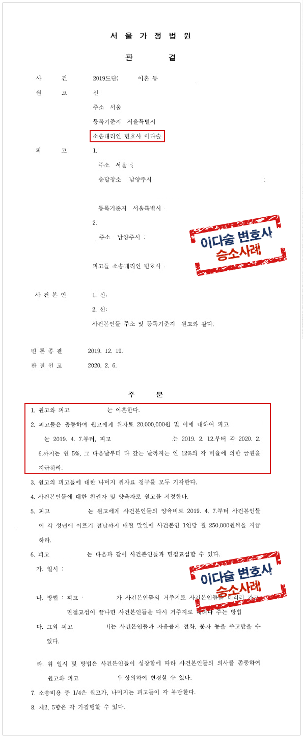 해당 사례는 이다슬 대표 변호사가 맡은 성공사례인데요. 의뢰인이자 한국이 남편인 A씨는 아내인 B씨를 상대로 이혼소송을 제기하는 동시에 상간남인 C씨에게도 위자료를 청구하는 소송을 제기하였습니다. 당시 B씨는 집을 나간 후 C씨와 함께 거주하면서 살고 있었는데요. 재판부는 B씨와 C씨의 부정행위를 인정하여 'B씨와 C씨는 공동하여 A씨에게 위자료로 2,000만원을 지급하라'는 판결을 이끌어낼 수 있었습니다.