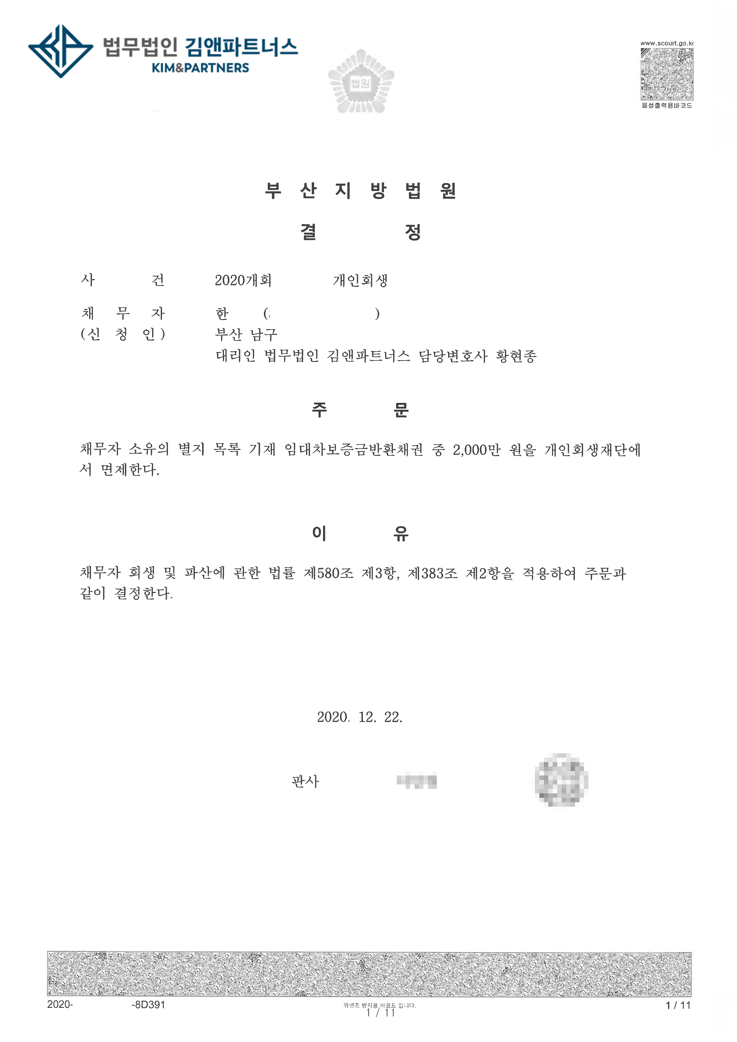 위 결정으로 인해 의뢰인은 보증금 7,000만원 중 2,000만원을 법원의 결정으로 면제재산으로 인정받게 되어 이에 해당하는 혜택을 받고 개인회생을 진행할 수 있게 되었습니다.