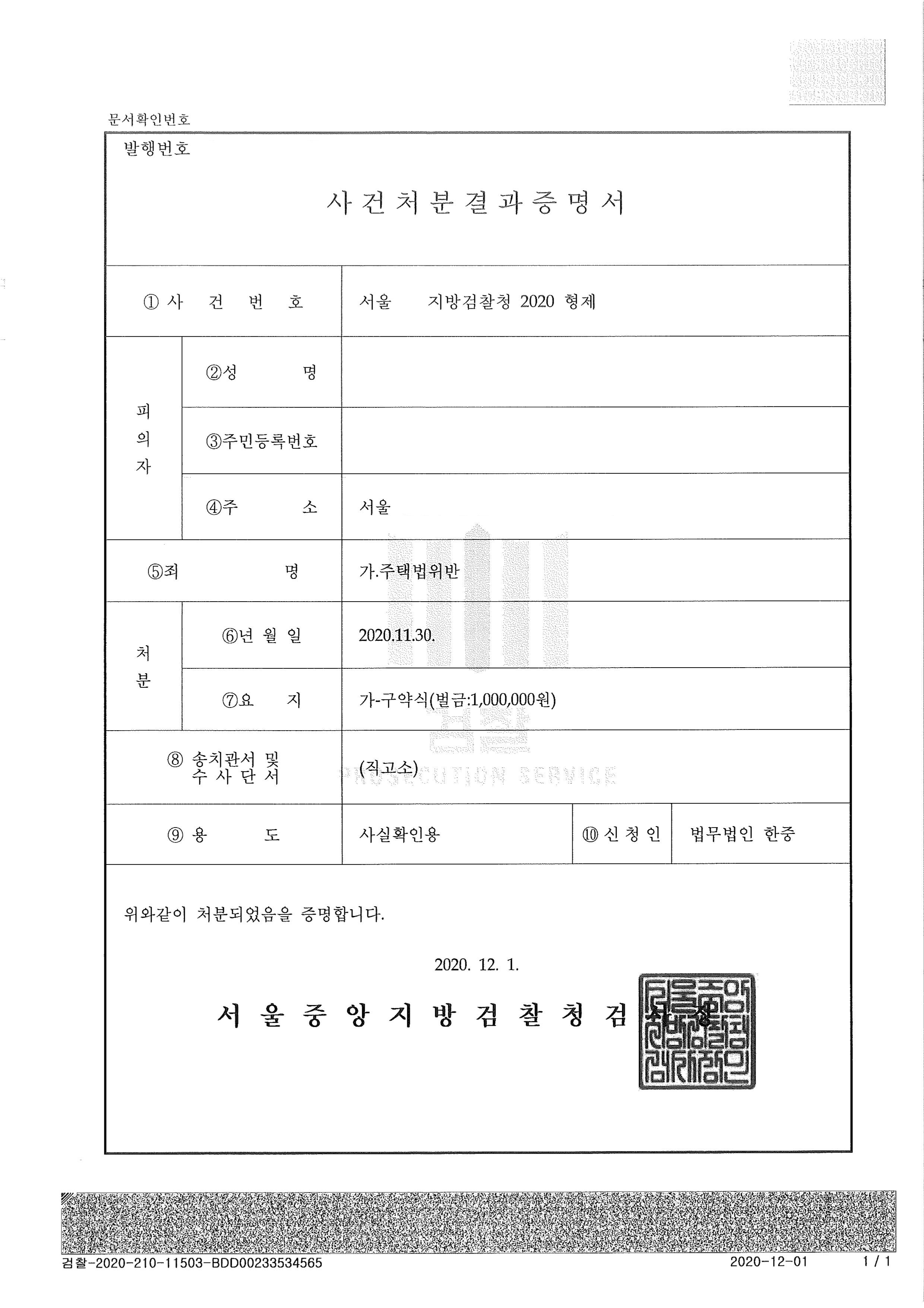 벌금 100만원의 구약식 기소되었습니다.