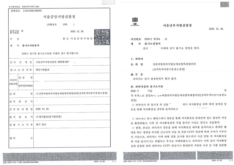 의뢰인의 자백이 있었음에도 불구하고 포기하지 않고 끝까지 법률적 의견을 개진한 결과 자백이 있었음에도 불구하고 성폭력범죄의처벌등에관한특례법 성폭법위반 성적목적다중이용장소침입 피의사실에 대해 혐의없음 불기소처분을 받을 수 있었습니다. 특히 화장실 몰카 사건의 경우 올해 개그맨이 구속되기도 하는 등 엄벌에 처하여지고 있는 상황이었고 자칫 구속될 가능성도 있었으나 적절한 변호를 통하여 혐의없음 불기소처분을 결국 받았습니다. 어떤 변호사에게 어떻게 변호를 받느냐에 따라 결과가 이렇게 달라질 수 있다는 것을 새삼 실감한 사건이었습니다.