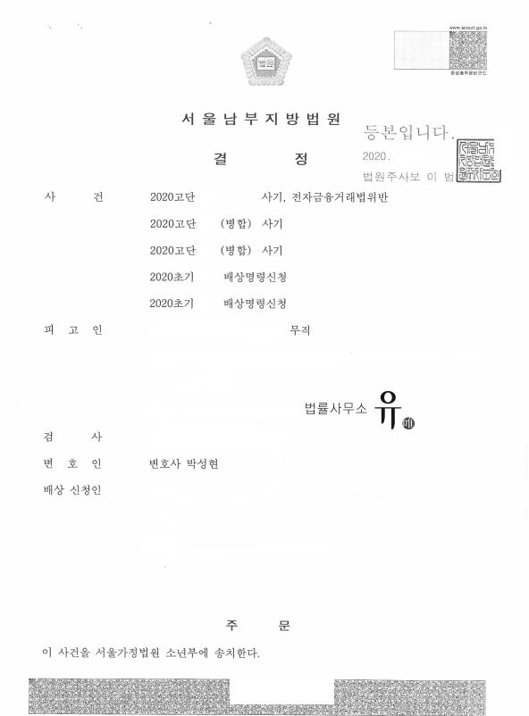 변호인의 위와 같은 소송전략과 구체적인 양형 주장으로, 결국 재판부는 형사재판에서 전과기록이 남지 않는 소년보호사건으로 송치 결정을 내려주었습니다.