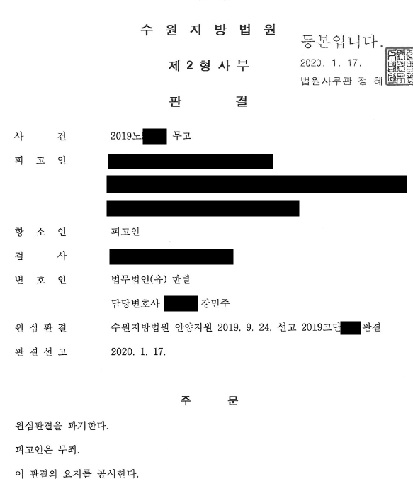 증인신문 등을 거쳐 마침내 무죄 판결을 이끌어 냈습니다.