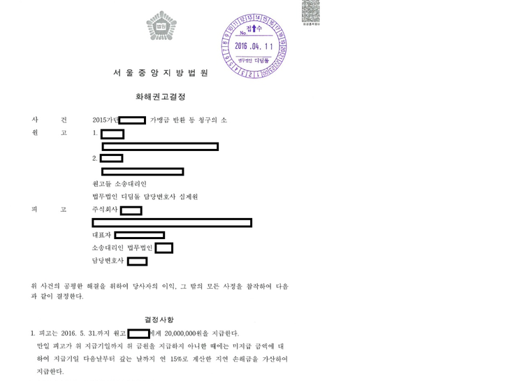 이에 소송을 제기하였고, 재판부에서 영업지역 침해와 이로 인한 매출 하락분을 인정하여 화해권고 결정을 내린 것입니다.