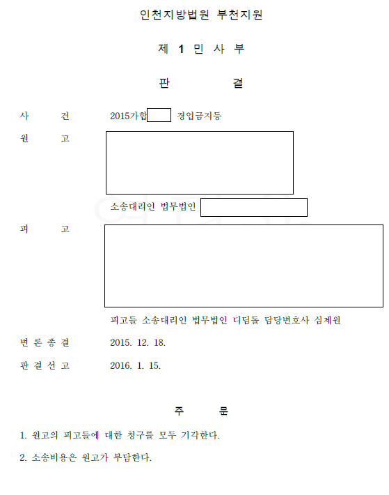 경업금지 가맹점주 승소, 동종영업 금지약정, 가맹사업변호사가 알려주는 승소사례 - 부천지원 승소, 가맹사업 승소