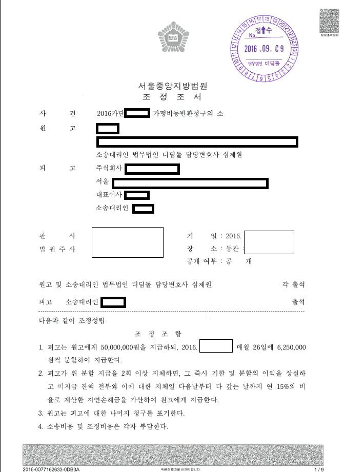 악덕 본사는 끝까지 쫓아가서 책임을 물어야 합니다. 그래야 세상이 만만하지 않다는 것도 알게되고, 다른 선량한 가맹점주에게 더 이상 나쁜 짓을 하지 못하게 되겠죠. 얼른 새로운 법인을 상대로 소장을 접수했습니다. 그리고 A와 B가 사실상 영업양도를 했다. 동일한 상호를 사용하고 있다는 취지의 서면을 작성했습니다. 그리고 마침내 첫 기일에 재판장님이 당연히 동일한 회사라고 하시면서 아예 당일날 조정을 하셨습니다. 매월 625만원을 8개월에 걸쳐서 분납을 하라는 취지로 작성이 되었고, 2회 이상 연체를 하면 즉시로 5,000만원 전액을 지급하라는 내용입니다.