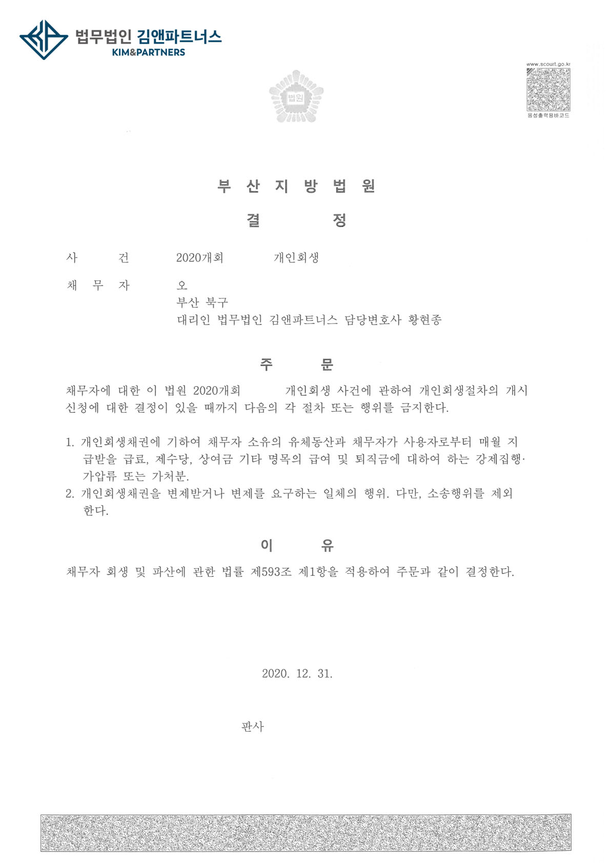 의뢰인은 금지명령으로 인하여 급여 압류의 위험에서 벗어나 개인회생 절차를 원활하게 진행할 수 있을 것입니다.