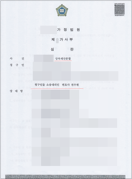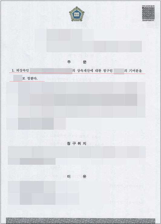 4. 아래 사안의 경우, 증거에 의하면 피상속인의 배우자의 기여분 인정에 있어, 특별성, 무상성이 다소 의문이나, 본인이 피상속인의 배우자의 소송대리인으로서 소송기술을 발휘하여 재판부에서 기여분을 인정하였다는 점에서 의미있는 사례라고 할 것입니다.