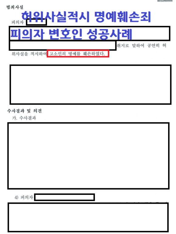 변호사님들이 머리를 맞대고 고민을 하시고, 허위사실을 말한 적도 없고 명예를 훼손할 고의가 없었다는 점 등을 상세히 진술 할 수 있도록 정리하였고 더불어 조사 종결 후 바로 변호인의견서도 제출하여, 혐의없음을 강력히 주장하였습니다.