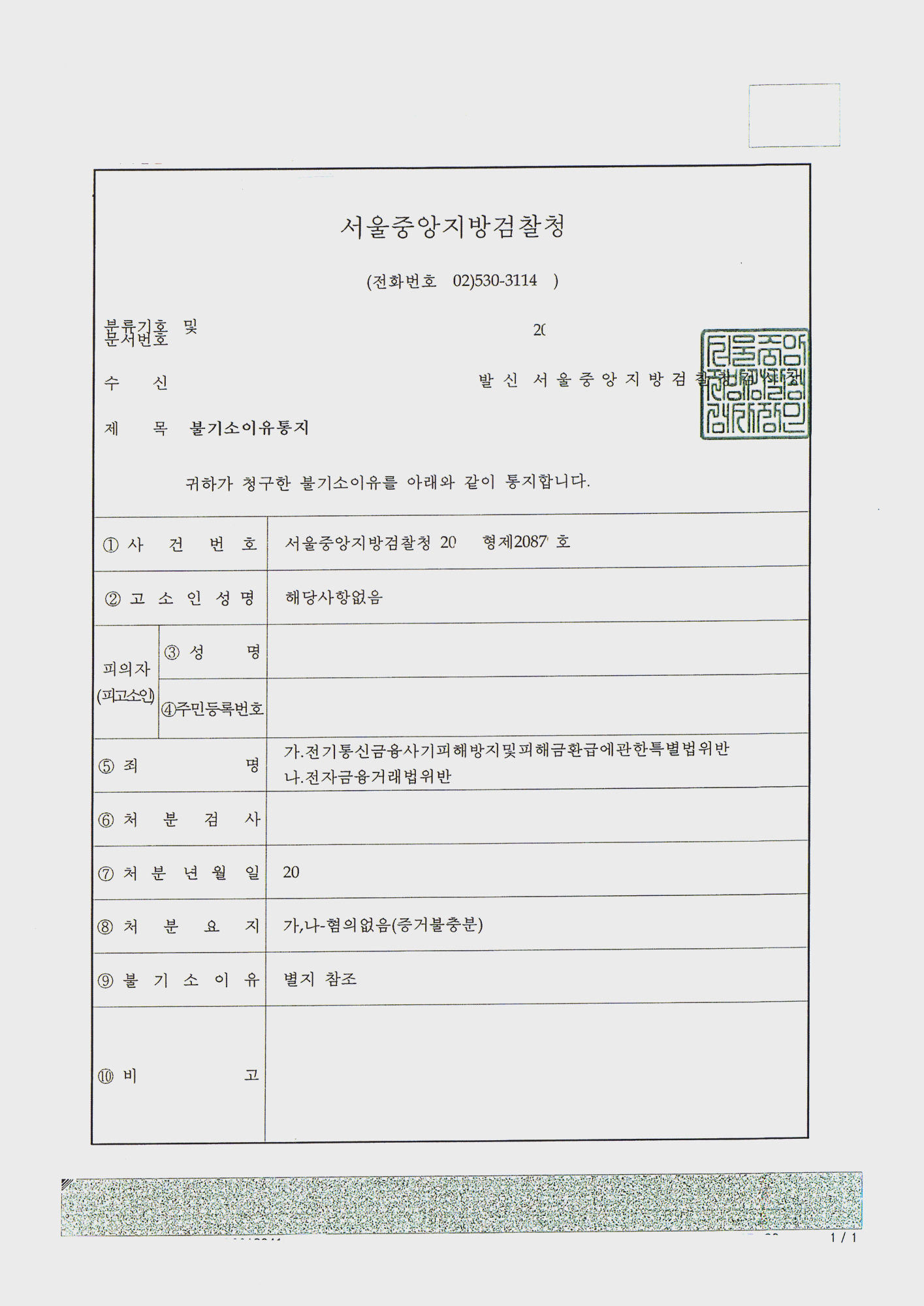 이 건으로 인하여 조사입회만 3번을 하였고 변호인 의견서는 총 4차례 제출하면서 적극적으로 변호에 임하였습니다. 지면에서 구체적인 것을 다 밝히지 못할 정도로 엄청난 시간과 노력을 들여 철저히 변호하였으며 불기소처분을 받을 수 있었습니다. 결과적으로 이 사건의 불기소처분 결과가 서울구치소 수감자들 사이에 소문이 돌아 보이스피싱 및 유령법인설립, 대포통장양도조직과 관련된 많은 건을 수임하기도 하였습니다.