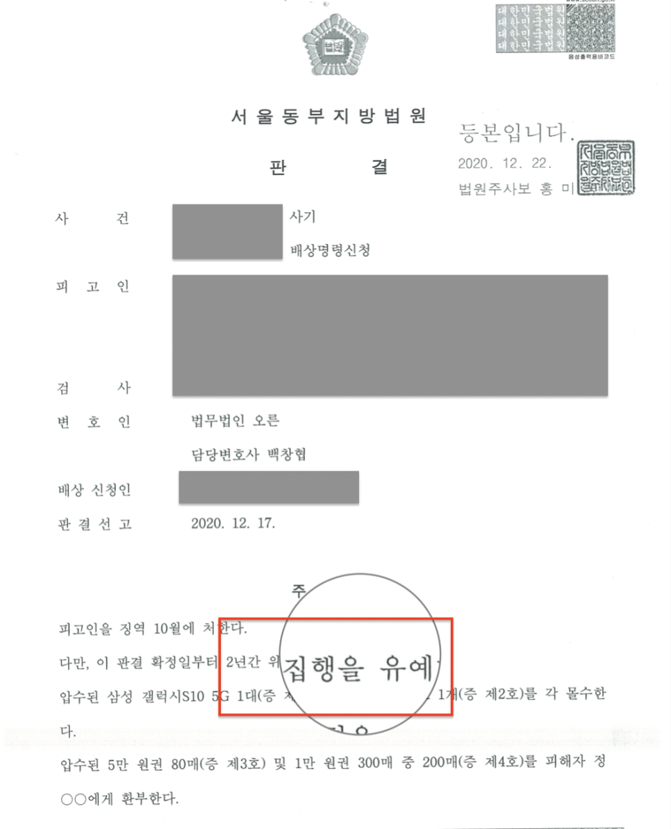 다행히 재판을 앞두고 의뢰인이 법무법인 오른을 찾아주셨고 해당 충고를 잘 받아들이셨기에 집행유예라는 판결을 이끌어내 구속되지 않고 가정의 품으로 돌아갈 수 있었습니다.