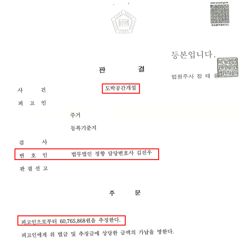 - 의뢰인은 온라인에서 도박공간을 개설하였다는 혐의로 기소되었고, 자신의 잘못은 인정하나 검찰이 주장하는 추징금 16억 원은 너무나 과다함을 주장하면서 이에 대한 대폭 감축을 요청하였습니다.