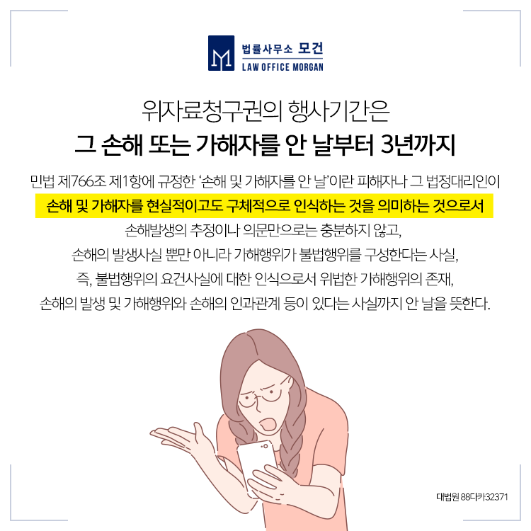 부정행위로 인한 이혼을 원인으로 한 손해배상청구권의 행사는 이혼한 날로부터 3년 내에 할 수 있습니다. C씨는 'B씨와 2014년에 헤어졌는데 상간녀소송은 2018년에 제기되었으니 소멸시효가 완성되었다'고 주장하였습니다.