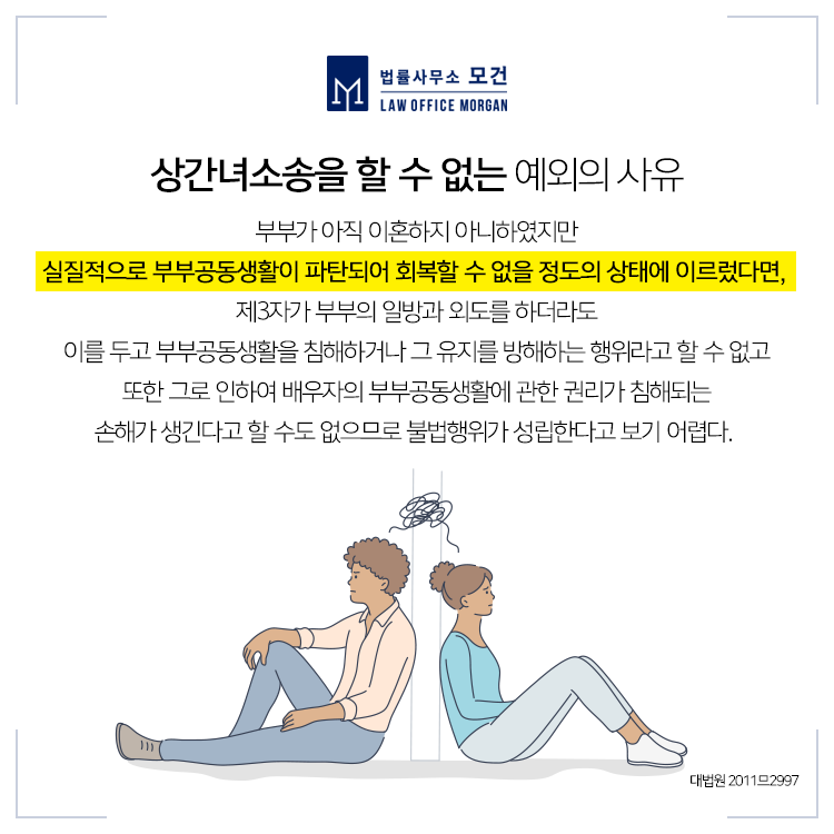 한편 D씨는 '자신이 B씨와 만났을 때에는 이미 A씨와 B씨의 혼인관계가 파탄상태에 있었으므로 부정행위를 할 수 없다'고 주장하였는데요. 물론, A씨가 2014년 11월 협의이혼을 준비한 바 있지만 최종적으로 무산되었고 A씨는 이후에도 B씨와의 부부관계를 이어갈 의사를 분명히 갖고 있었습니다. 또한 B씨로부터 생활비를 받아 자녀들을 양육하면서 함께 가족여행을 가는 등 일정한 교류를 유지하고 있었습니다.