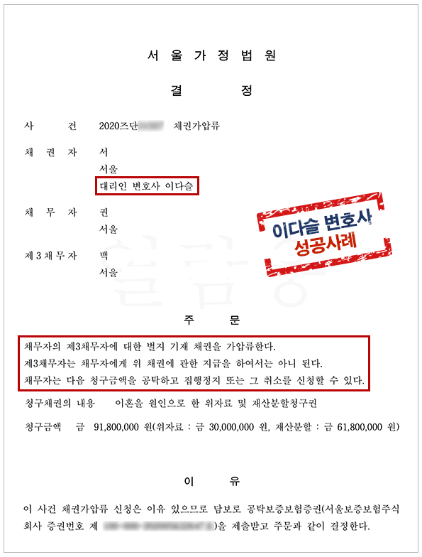 의뢰인께서는 이다슬 대표 변호사의 도움을 받아 이혼소송 전 배우자를 상대로 전세보증금에 대한 채권가압류를 신청하셨습니다. 추후 임대차계약이 종료되면 집주인(임대인)으로부터 반환받아야 하는 전세보증금이 있는데, 이혼소송 사실을 모르고 있던 집주인이 계약만료 후 이를 배우자에게 지급해 배우자가 이를 사용하거나 은닉해 의뢰인이 받아야 하는 위자료와 재산분할이 어려워질 수 있는 것을 방지하기 위함입니다.