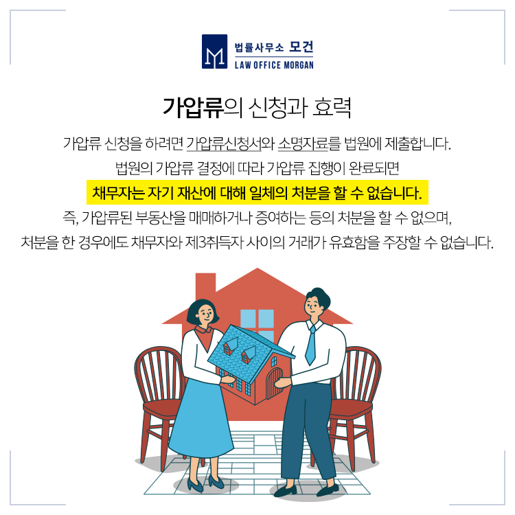 법원의 가압류 결정에 따라 가압류 집행이 완료되면 채무자는 자기 재산에 대해 일체의 처분을 할 수 없습니다. 즉, 가압류된 부동산을 매매하거나 증여하는 등의 처분을 할 수 없으며, 처분을 한 경우에도 채무자와 제3취득자 사이의 거래가 유효함을 권리자(즉, 가압류를 집행한 상대 배우자)에게 주장할 수 없습니다.