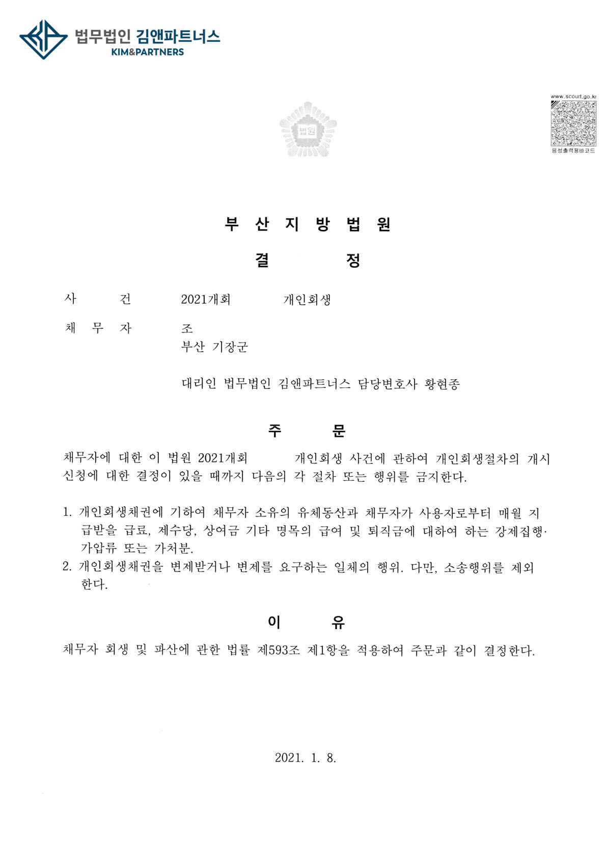 의뢰인은 금지명령으로 인하여 급여 압류의 위험에서 벗어나 개인회생 절차를 원활하게 진행할 수 있을 것입니다.