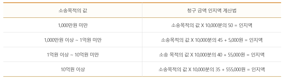 일반 민사소송을 제기할 경우에는 아래와 같은 기준에 따라 인지대를 별도로 납부하여야 하고 별도의 변호사비도 소요되는 애로사항이 있습니다. 다만 형사재판에서 유죄가 선고된 경우 민사상 불법행위 손해배상청구에서 승소하는 것은 매우 쉬운 것이므로 통상적으로 변호사비는 최소한의 금액만 받는 것이 보통입니다.