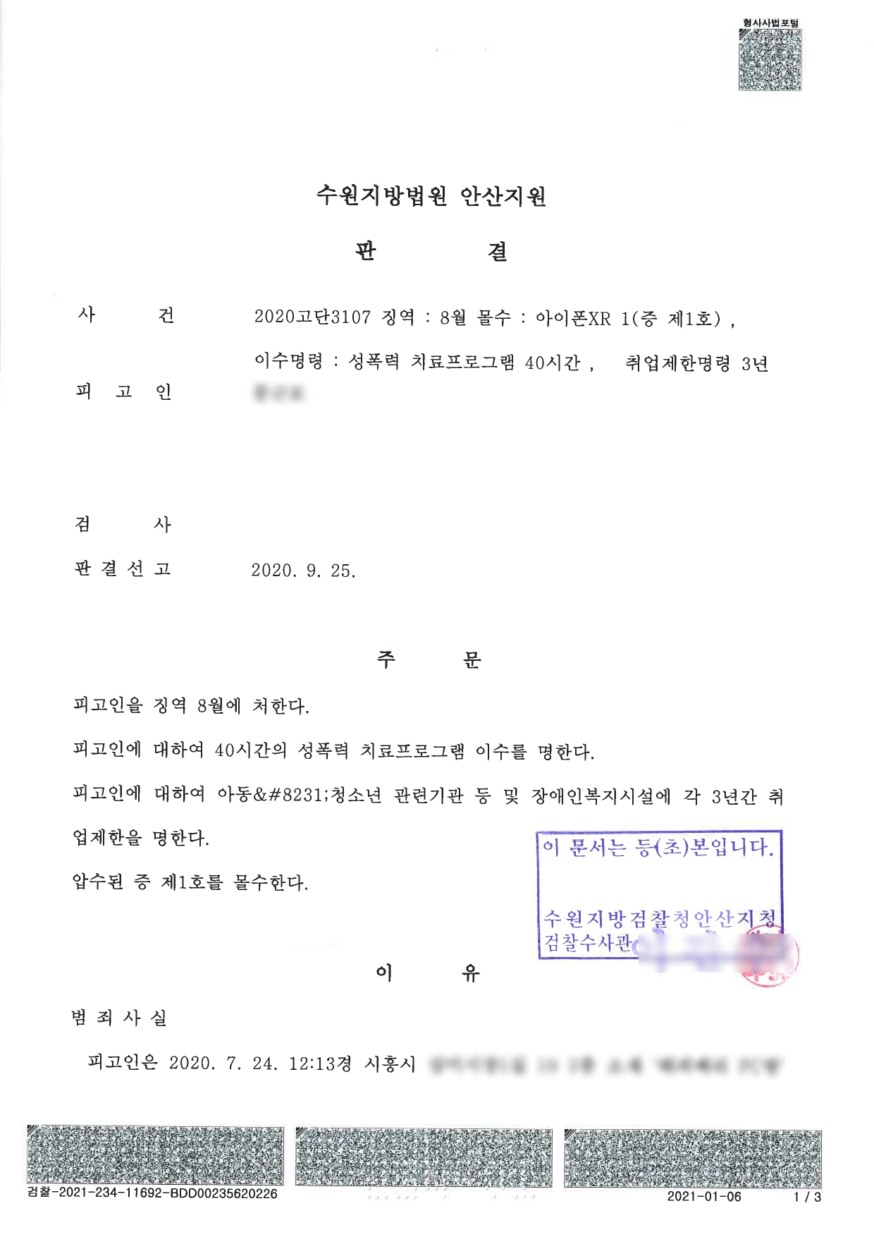 피고인에 대하여 아동‧청소년 관련기관 등 및 장애인복지시설에 각 3년간 취 업제한을 명한다. 이 문서는 등{초)본입니다.압수된 중 제1호를 몰수한다.