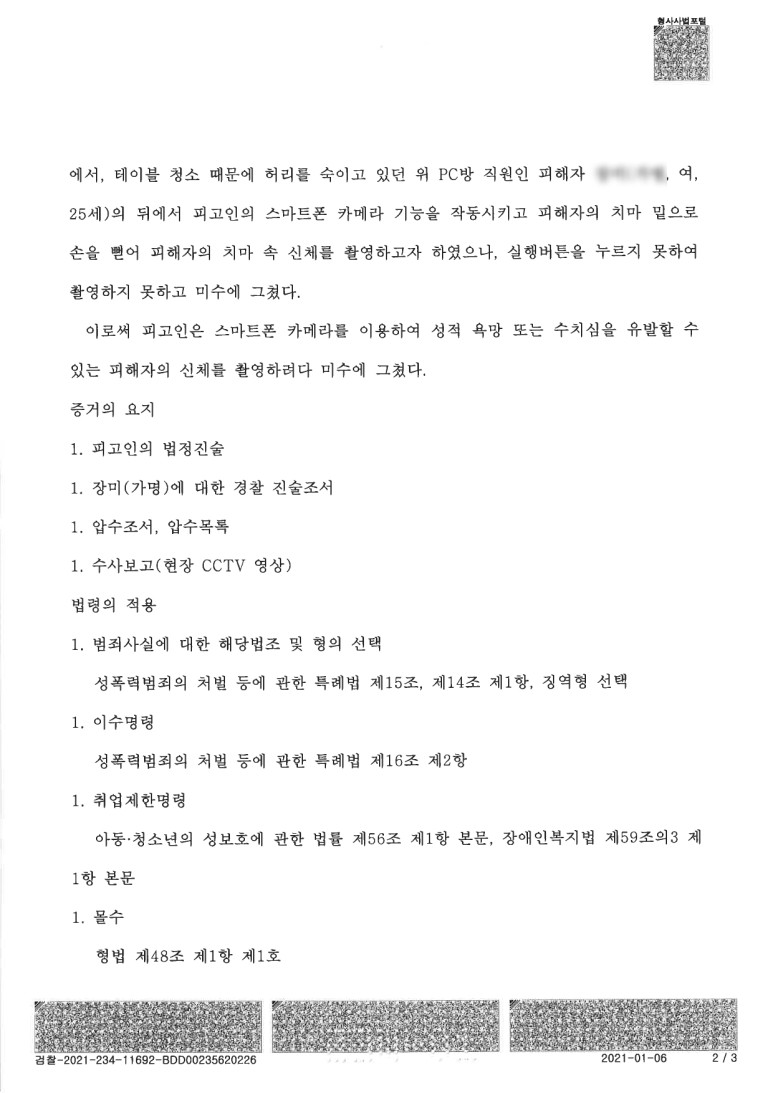 피고인은 2020. 7. 24. 12:13경 시흥시 ㅇㅇㅇ에서 테이블 청소 때문에 허리를 숙이고 있던 위 pc방 직원인 피해자 여(25세)의 뒤에서 피고인의 스마트폰 카메라 기능을 작동시키고 피해자의 치마 밑으로 손을 뻗어 피해자의 치마 속 신체를 촬영하고자 하였으나, 실행버튼을 누르지 못하여 촬영하지 못하고 미수에 그쳤다.
