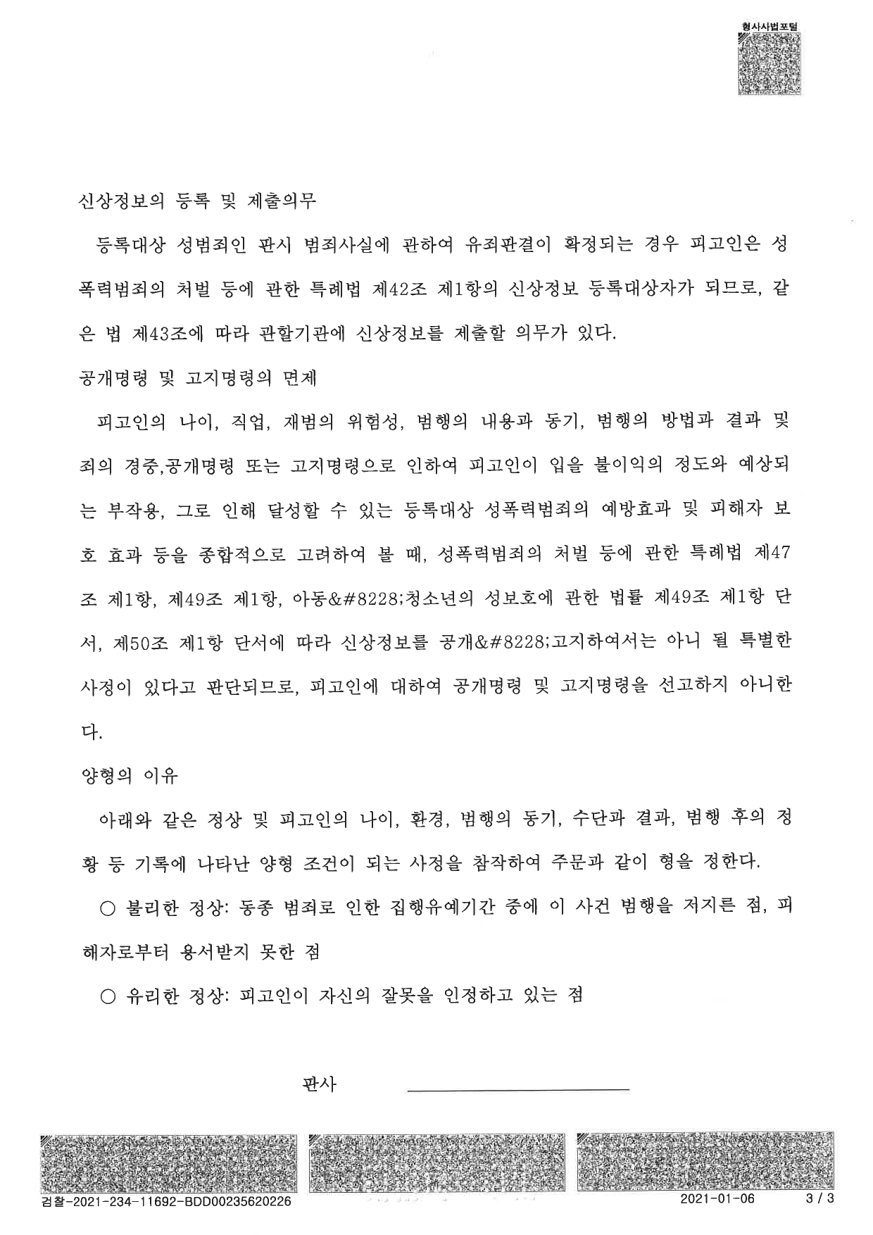 등록대상 성범죄인 판시 범죄사실에 관하여 유죄판결이 확정되는 경우 피고인은 성 폭력범죄의 처벌 등에 관한 특례법 제42조 제1 항의 신상정보 등록대상자가 되므로, 같 온 법 제43조에 따라 관할기관에 신상정보를 제출할 의무가 있다.