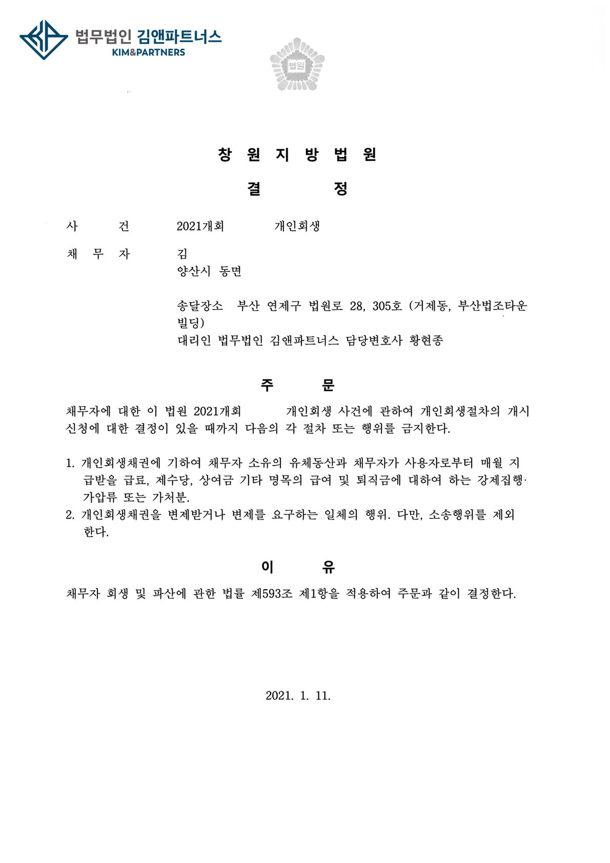 의뢰인은 근무지가 김해에 있다고 하셨고 황변호사는 개인회생 절차를 빨리 진행할 수 있는 창원지방법원에 개인회생 신청을 하여 진행하기로 하였습니다.