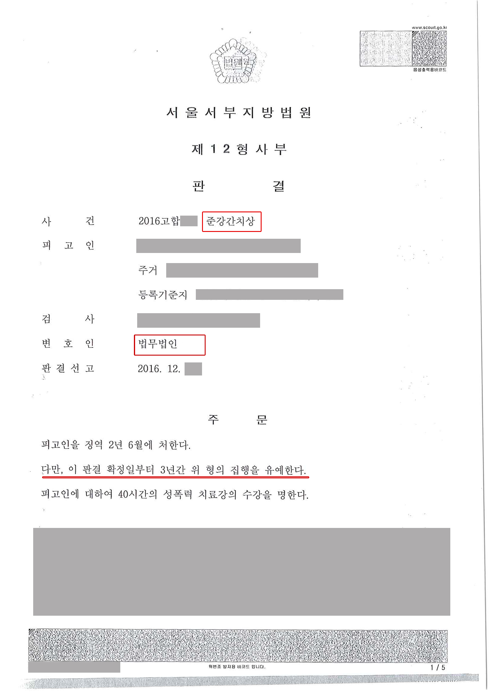 사건기록 검토 및 의뢰인과의 상담을 통해 무혐의를 주장하는 것은 쉽지 않겠다는 결론에 이르렀습니다. 자칫 무죄만을 주장하는 것은 오히려 실형 선고를 받게 될 위험이 있었기에 일부 혐의를 인정하고 처벌정도를 경감시키는데 목적을 두었습니다. 이를 위해 먼저 피해자와의 조속한 합의를 통해 처벌 불원 의사원을 받아 법원에 제출하였으며, 과거 피해자와 다수 만남을 가지고 여행도 갔던 사이었음을 입증 할수 있는 문자메세지, 철도승차권 결재 내역 등을 법원에 제출하였습니다. 또한 피해여성이 제출한 상해진단이 통상 일상생활에서도 충분히 발생할 수 있는 것이라는 전문의의 소견서도 제출하였습니다. 이에 법원은 준강간행위가 있었고 이로 인해 상해의 결과가 발생한 것은 인정되나, 상해의 정도가 굉장히 경미하고 피해자가 처벌을 원치 않는 점 등에 비추어 작량감경을 통해 징역 2년 6개월 및 집행유예 3년을 선고하였습니다. 아울러 40시간의 성폭력 치료강의 수강을 보안처분으로 부가하였습니다. 이로 인해 다행히 의뢰인은 교도소 실형을 피할 수 있었습니다.