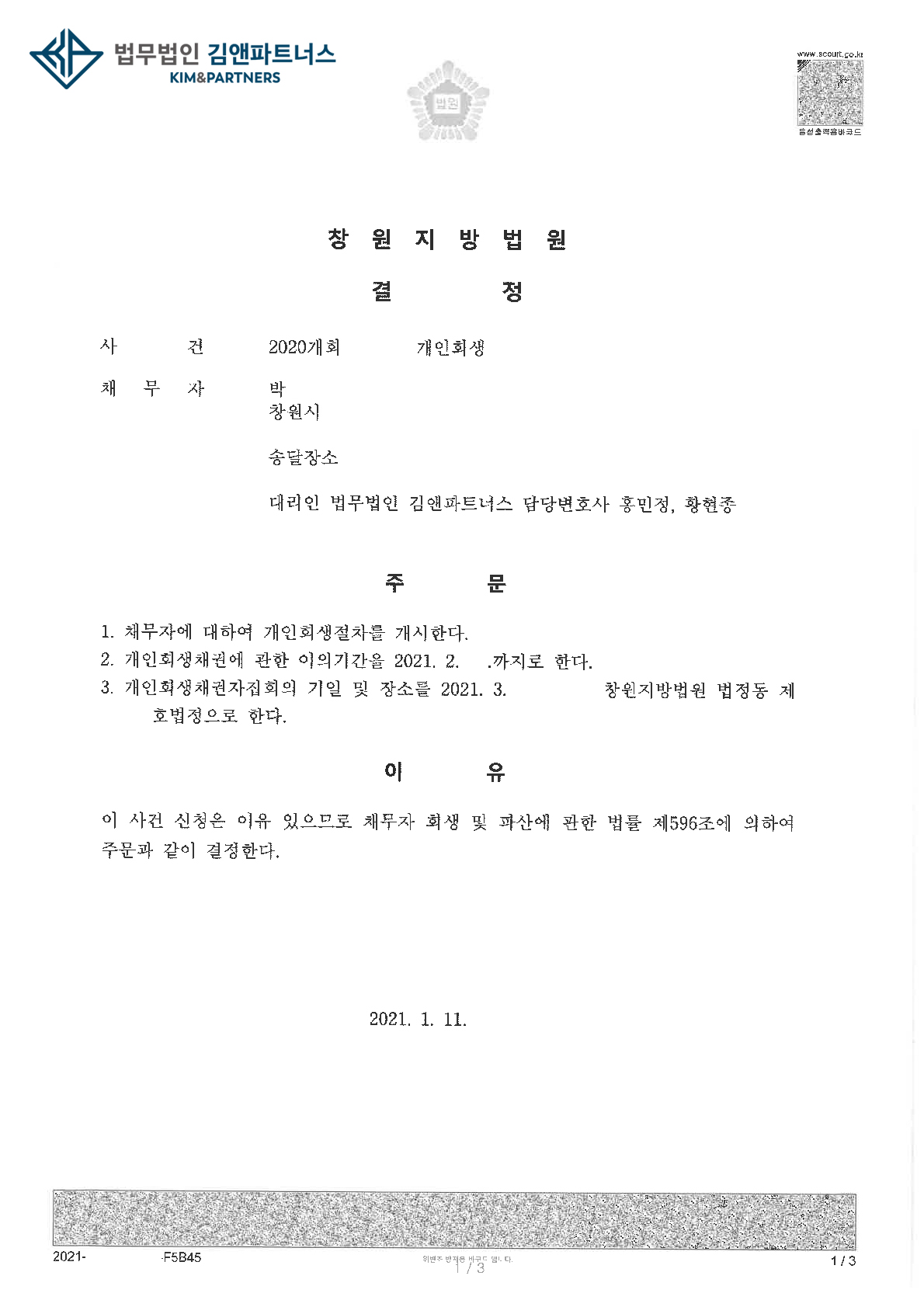황변호사는 창원지방법원에서 최근 개인회생 개시결정을 받았습니다.