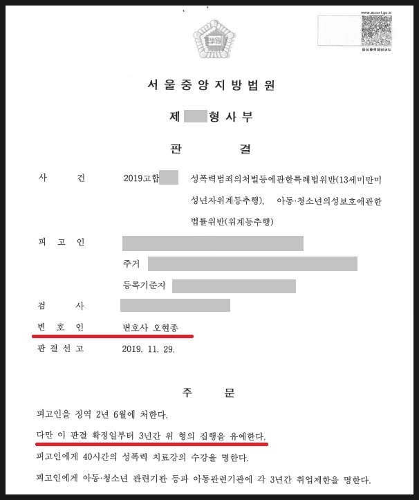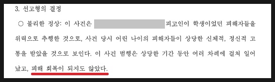 - 피해자 중 1명이 사건 당시 13세 미만 미성년자라서 성폭력처벌특례법 상 13세 미만 미성년자 추행죄가 적용(법정형 5년 이상의 유기징역, 집행유예 불가능)