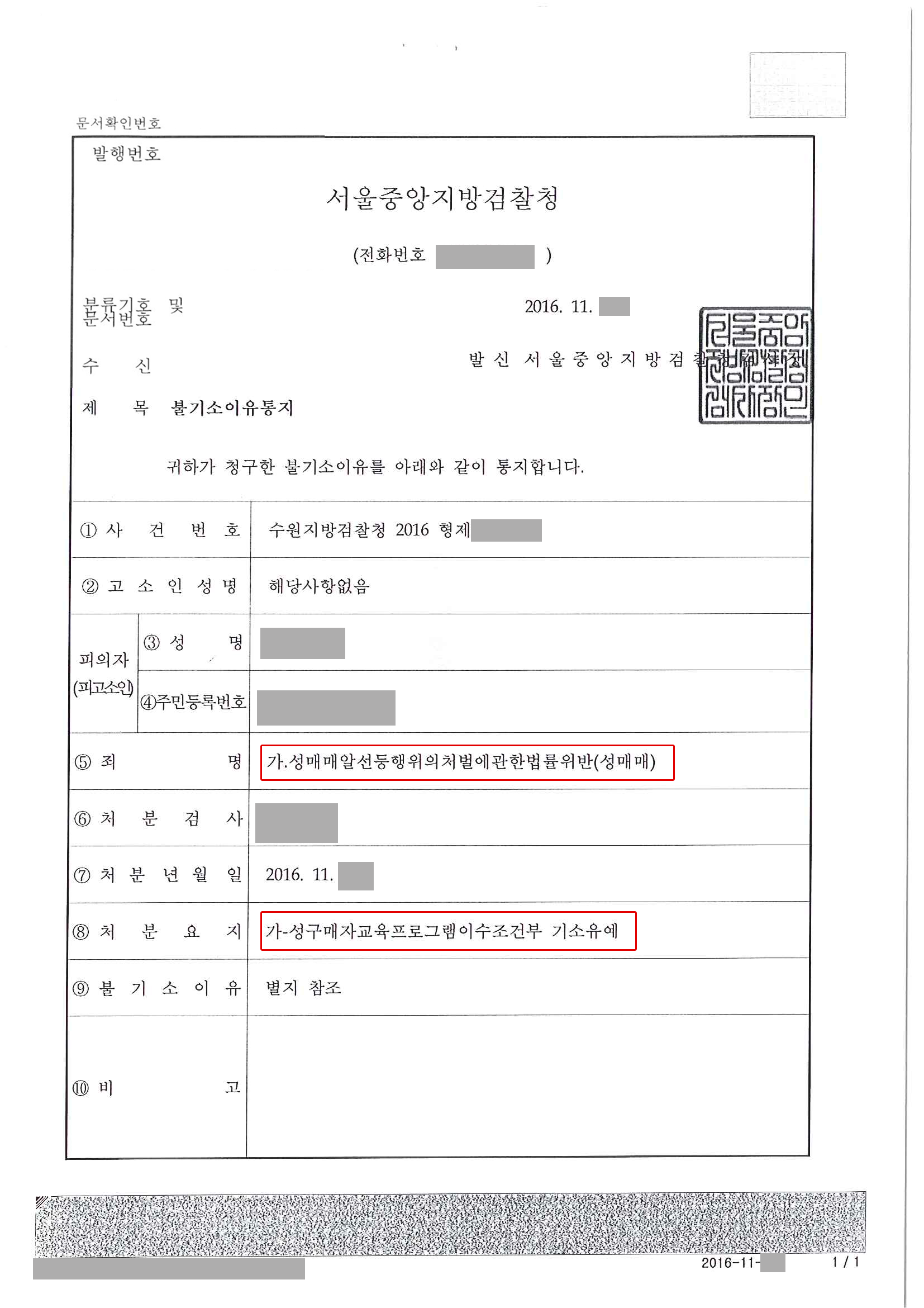 의뢰인을 통해 상황을 설명들은 저희는 무혐의를 입증할 수 있는 방법을 찾기 위해 수사기록 열람등사를 통해 사건기록을 분석하였습니다. 먼저 다른 성매매업소 여성이 의뢰인을 지목한데 대하여 의뢰인이 방문하던 시각인 늦은 시각이었으며, 참고인이 의뢰인을 봤다고 진술한 근거는 증명사진 1장 뿐이라는 사실을 지적하였습니다. 특히 참고인은 자신이 본 사람은 키가 크고 덩치가 있다는 이야기를 한 반면 의뢰인은 키가 작고 왜소한 체격인 점을 수사기관에 설명하였습니다. 또한 사건의 성매매업소는 예약제였는데 사건당시 의뢰인과 만나기로 한 업소여성은 자신은 성매매를 한적이 없다고 극구 부인하고 있는 점을 포착하였습니다. 하지만 의뢰인의 통화내역 열람을 통해 성매매업소 대표번호로 수차례 발신전화 기록이 있었던 점을 검찰이 인지하게 되었고, 계속 혐의를 부인하다가는 법원으로 사건이 송치될 위험이 있다고 판단, 일부 혐의를 시인하고 기소유예 처분을 받는데 목적을 두고 탄원서 등을 제출하였습니다. 이에 검찰은 초범인 점, 반성의 태도가 있는 점 등을 고려하여 성구매자교육프로그램조건부 기소유예 처분을 내렸습니다.