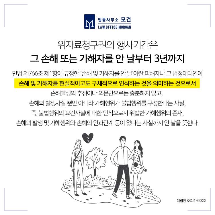 부정행위는 「민법」 상 불법행위라 볼 수 있는데요. 불법행위로 인한 손해배상청구권은 '그 손해 및 가해자를 안 날로부터 3년간' 이를 행사하지 않으면 소멸됩니다. 그런데 여기서 '손해 및 가해자를 안 날'을 잘 확인하셔야 소멸시효가 완료되었다는 이유로 소송이 패소되는 것을 막을 수 있습니다.