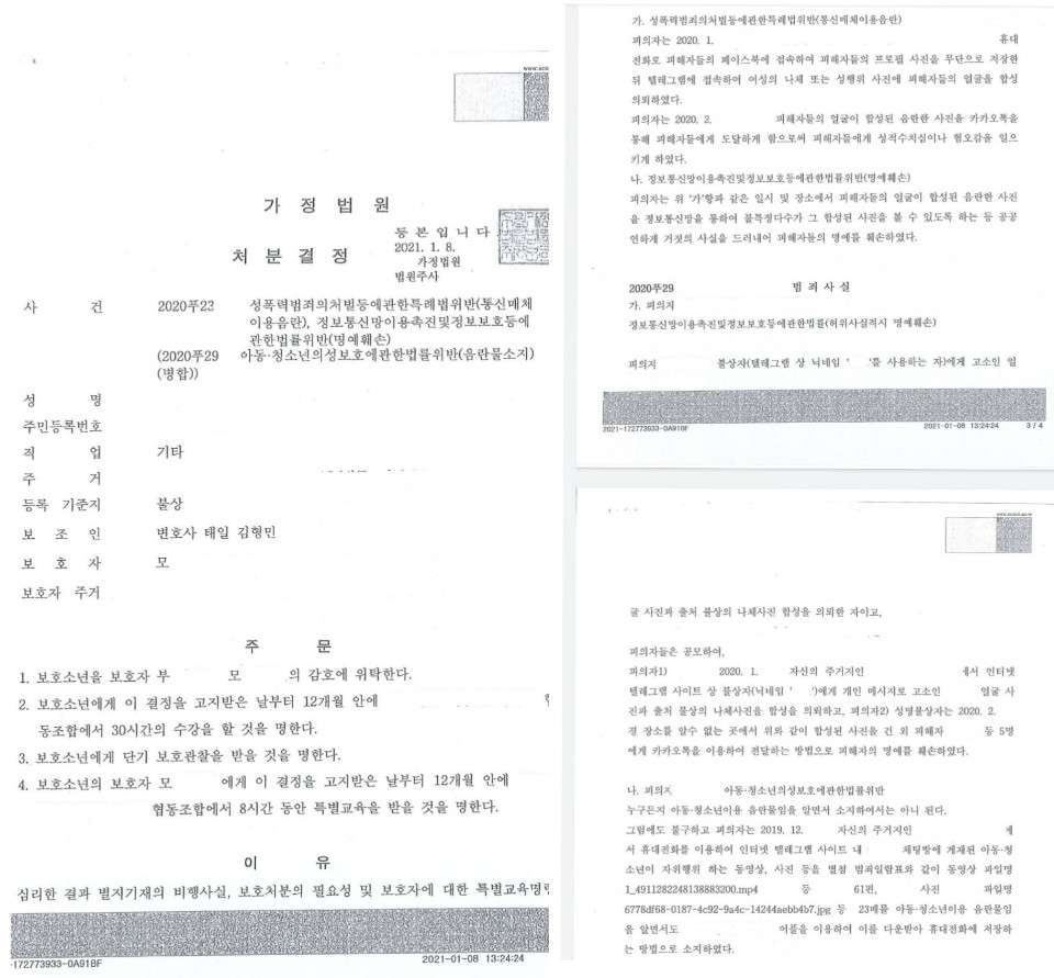 아동청소년의성보호에관한법률(아청법) 아청물소지죄만으로도 소년부송치처분이 어려운 것이 현실임에도 성폭력범죄의처벌등에관한특례법(성폭법)상 통신매체이용음란(통매음), 명예훼손까지 존재하였습니다. 다수의 피해자가 존재하였고 성범죄의 경우 피해자와 합의되지 않는 경우 소년보호처분이 아닌 검찰송치(최악의 결과임)가 이루어져 형사재판으로 돌아가 벌금형, 집행유예가 선고될 가능성도 큰 사안이었습니다. 보호소년에 관한 양형, 즉 반성하고 있고 재범우려가 없는 등의 일반적으로 당사자와 보호자, 지인이 준비할 수 있는 양형자료만으로는 미흡한 상황이었기 때문에 사건 자체의 양형에 집중하였습니다. 양형을 위하여 선임된 경우 대부분의 변호사가 반성문, 선처탄원서, 성교육이수 등 굳이 변호사를 선임하지 않더라도 인터넷에서 찾아서 스스로 할 수 있는 정도의 조력을 하는 것이 현실이나, 저는 평소 당사자가 커버할 수 없는 변호사만 할 수 있는 변호를 반드시 하여야 한다고 생각하고 있습니다. 사건을 면밀히 검토한 결과 다른 사건들과는 다른, 이 사건에 독특한 매우 유리한 양형요소를 발견하여 이를 중점적으로 변호한 결과(법정에서의 임기응변도 있었고 결과적으로 중요하게 작용하였음) 피해자들과 합의도 없었으나 단기보호관찰처분을 받을 수 있었습니다.