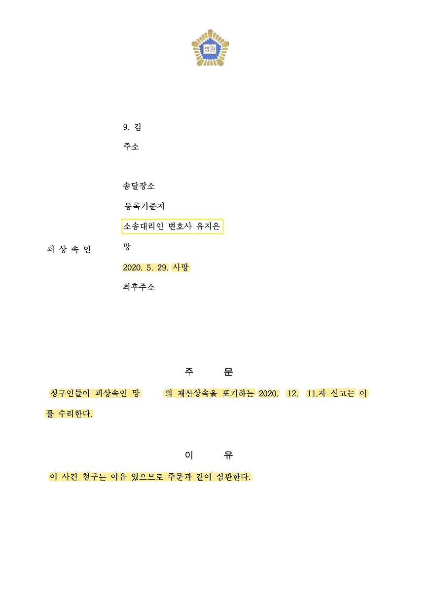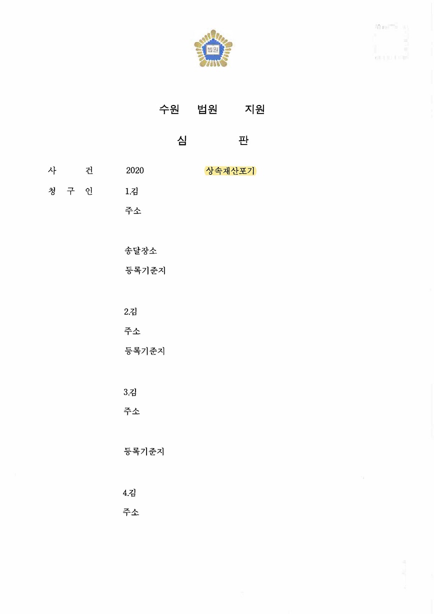 심판청구를 한 날로부터 한 달도 되지 않아 상속포기 신고를 모두 수리한다는 심판문을 받았고, 의뢰인의 상속 문제를 말끔하게 해결하였습니다.