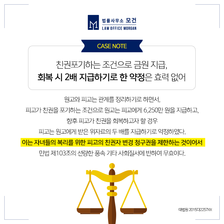 유책배우자는 이혼청구가 불가하고 이혼소송 시 위자료가 인정되는 등 여러모로 자신이 불리할 것을 예상하여 상대방이 요구하는 조건에 따라 협의이혼을 하는 경우가 있습니다. 이때 상대방의 요청에 의해 '친권·양육권을 포기한다'거나 '면접교섭권을 행사하지 않겠다'는 각서가 효력이 있을까요?
