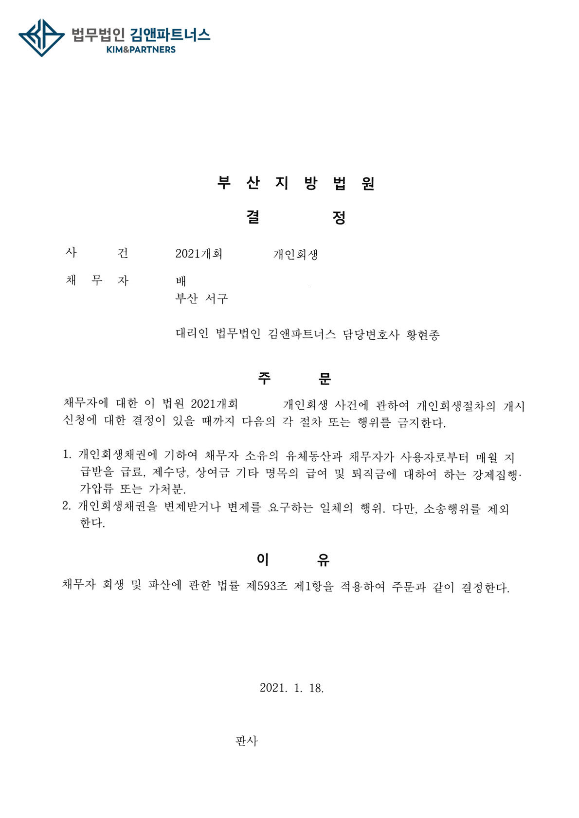 황변호사는 의뢰인과 상담 후 개인회생 절차가 문제없이 진행될 수 있는 것에 대해 설명하고 사건을 담당하여 의뢰인이 개인회생 절차를 잘 진행할 수 있도록 금지명령도 받았습니다.