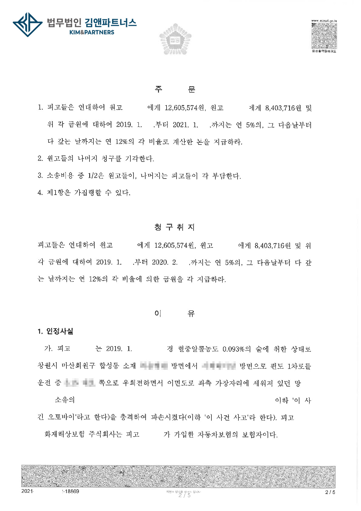 보험사는 한순간 잘못된 선택으로 1,500만원만 줘도 될 것을 2,100만원에 소송상 이자 및 변호사보수까지 물어줘야 할 처지에 놓이게 되었습니다.