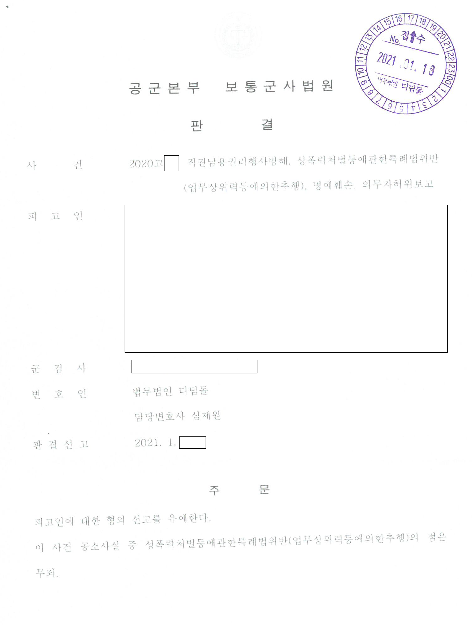 안녕하세요. 심제원 변호사입니다. 오늘은 공군본부 보통군사법원에서 최근 선고한 사건에 대한 성공사례를 포스팅을 합니다.