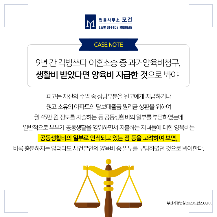 하지만 재판부는 A씨의 손을 들어주었습니다. B씨로부터 이혼 당시 지급받은 1억원 상당은 B씨의 부정행위로 결국 협의이혼에 이르게 되면서 B씨가 써준 각서에 따라 위자료로 지급받은 것일 뿐이고, 1억원 중 4천만원은 신혼집의 전세보증금을 돌려받아 채무를 변제한 것이므로 이를 고려하면 그 액수가 양육비 일시지급에 해당된다고 볼 수 없다고 보았습니다.