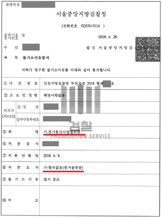 불기소 처분 (혐의없음)