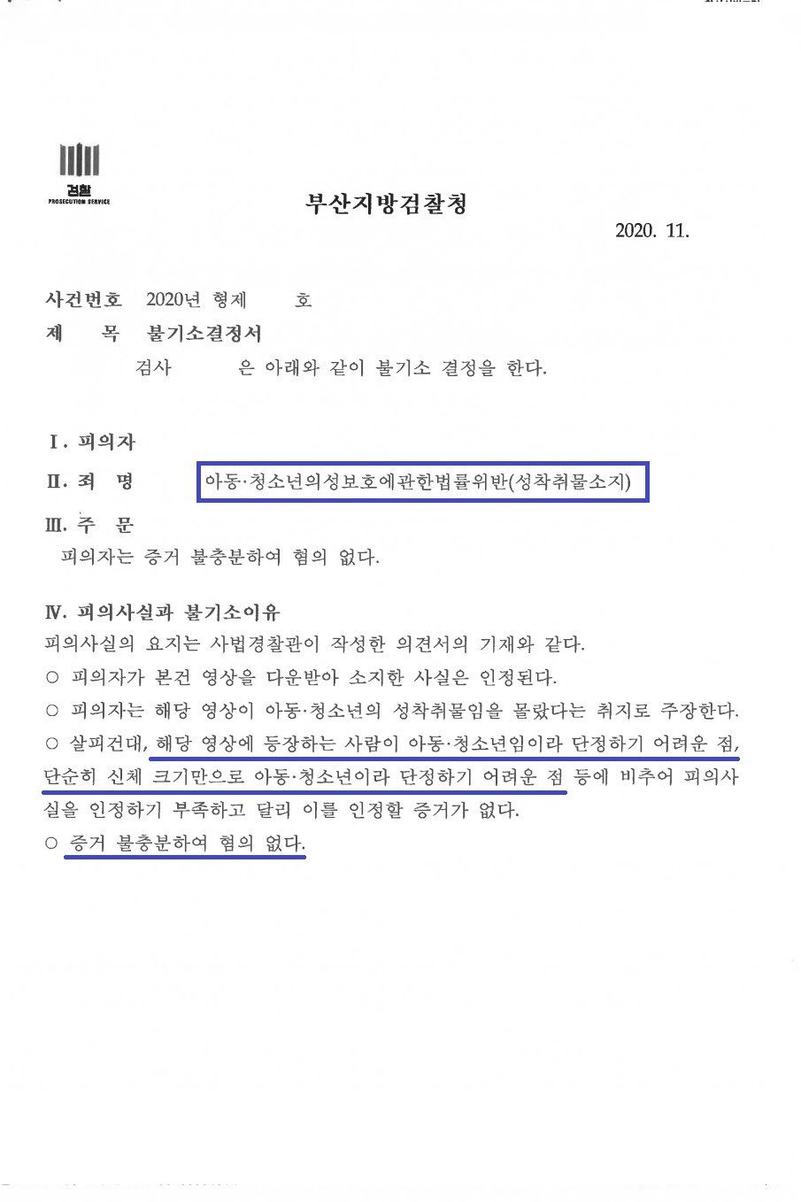 결국 수사기관은 해당 영상에 등장하는 사람이 아동·청소년이라 단정하기 어려우며, 단순히 신체 크기만으로 아동·청소년이라고 단정하기 어렵다는 점을 근거로 혐의없음 처분을 하였습니다.