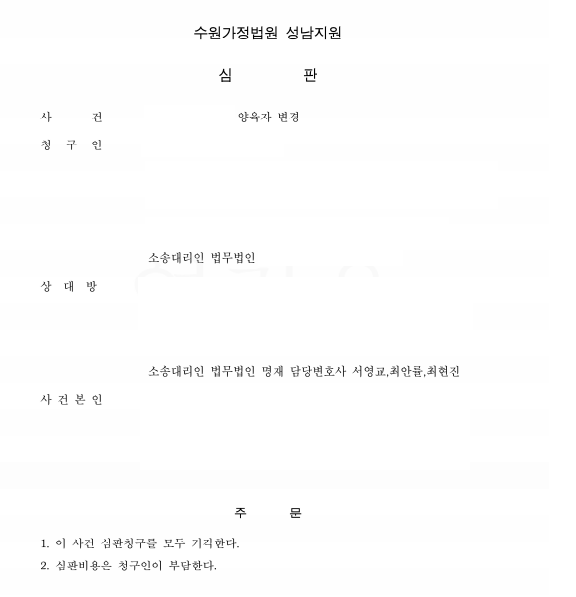 양육자 변경 청구 심판 사건입니다. 본 사안은 협의이혼 당시 양육자 지정에 동의했던 원고가 사정 변경을 이유로 피고에게 양육자 변경을 신청한 사건입니다. 저희는 피고를 대리했으며 피고는 양육에 대한 의지가 강했습니다.