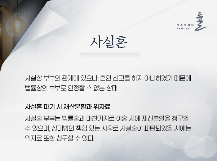 이처럼 두 사람 사이를 해소할 때 법적으로 처리해야 될 문제가 있다면, 우선 성립요건에 부합하는지를 밝히는 과정이 필요합니다. 혼인신고를 안 했다는 이유로 유책 배우자에 대해 자산을 나눌 것을 요구하고 손해배상 청구를 하는 것을 주저하는 이들이 많습니다. 그러나 속앓이를 하기보단 서초동이혼소송 변호사 가족법센터 률의 면담을 통해 구체적인 권리를 확인한 뒤 적절한 조치를 취하며 절차를 밟아나가는 게 좋을 것입니다.