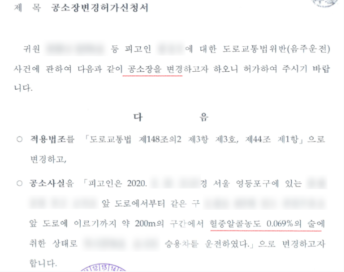 이러한 주장이 받아들여져 도로교통법위반(음주운전)의 적용법조와 공소사실에 관한 검사의 공소장 변경을 이끌어냈습니다.