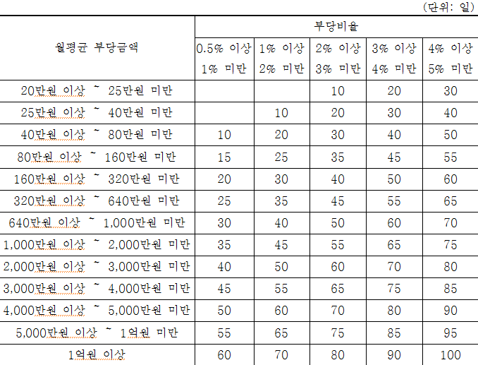 국민건강보험법 시행규칙에서는 다음과 같이 부당금액 및 부당비율에 따른 업무정지처분기준을 마련해 놓고 있습니다.
