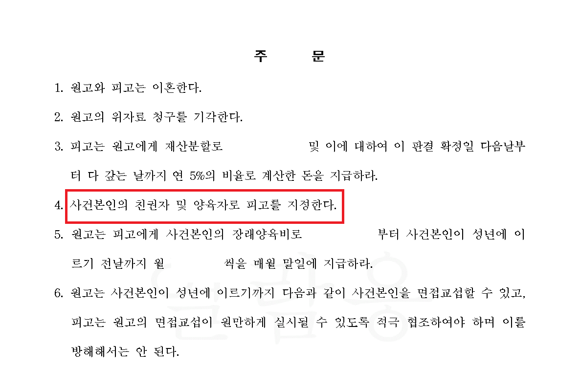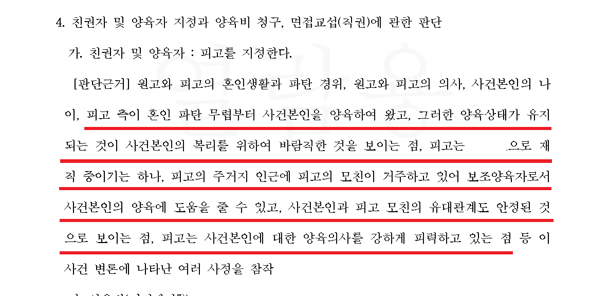 그리고 이혼 전 1년간은 아내 또한 직장에 다니면서 주양육을 시어머니(의뢰인의 어머니)에게 맡겼고, 이혼 소송이 시작되며 별거를 할 때부터 의뢰인이 어머니의 도움을 받아 아이를 양육하고 있으며 양육환경이 안정적이므로 양육권을 상대방에게 줄 경우 아이의 정서에 좋지 않을 것이라는 점을 적극적으로 피력했습니다.