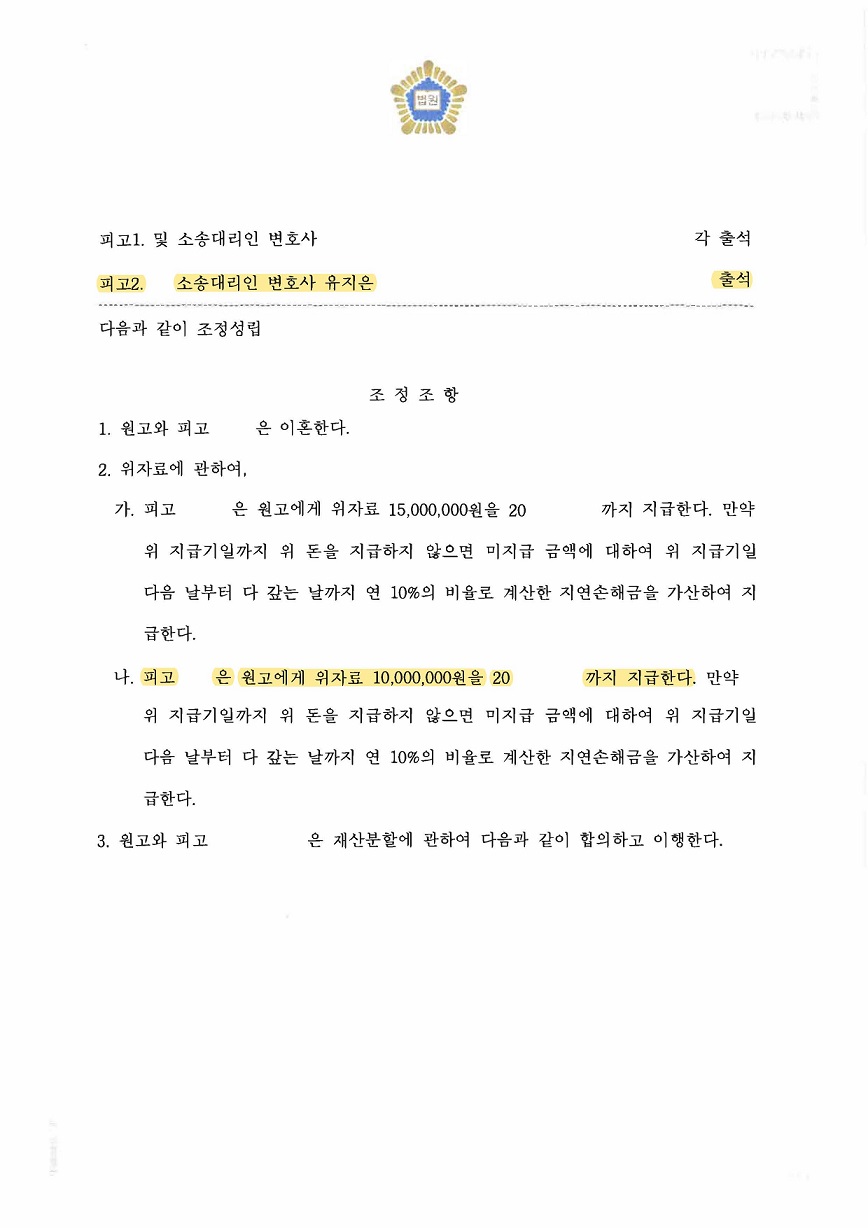 결국 의뢰인이 원하는 대로 단시간 내에 조정으로 마무리 할 수 있었고, 천만 원을 지급하는 것으로 위자료 액수를 방어함으로써 성공적으로 마무리한 사안입니다.