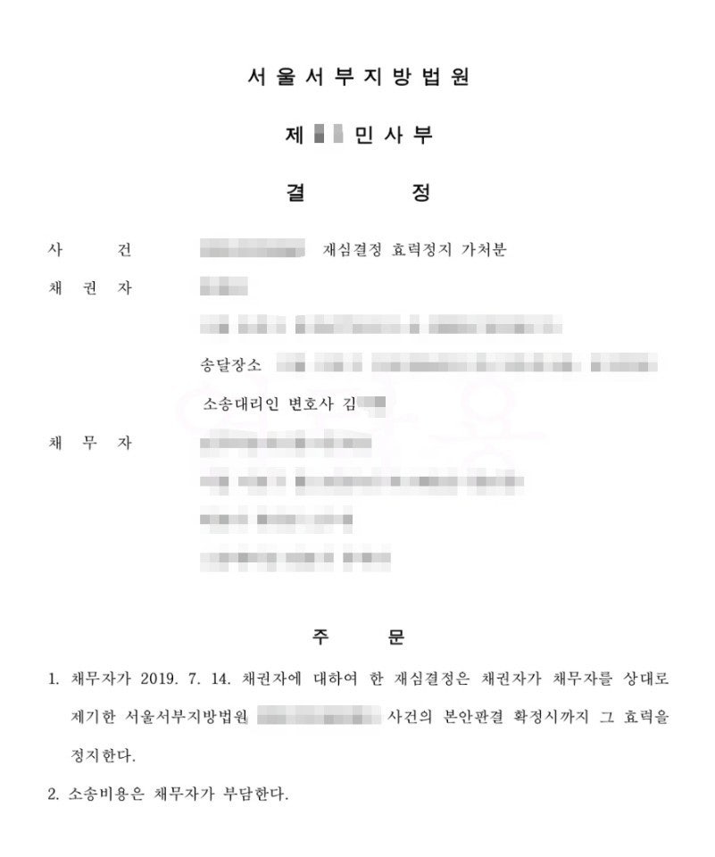 본안소송에 대한 판단이 이루어지기 전에 먼저 가처분 심문기일이 지정되었고, 2번의 심문기일과 추가 준비서면 제출 등을 거쳐 최종적으로 가처분신청이 인용됨으로써, 1심 본안판결 확정시까지 재심결정의 효력이 정지되게 되었습니다. 현재 본안처분도 승소 할 확률이 99%입니다.