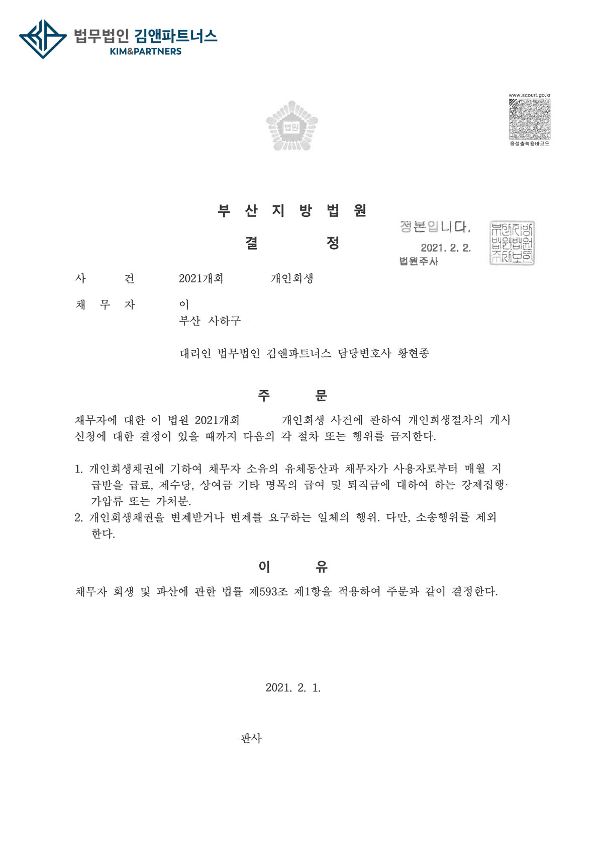 의뢰인은 황변호사와 상담 후 다행히 2020년 10월 직장을 구하여 개인회생을 신청하기로 하였고, 황변호사는 의뢰인을 위해 금지명령을 신청하여 금지명령을 받았습니다.